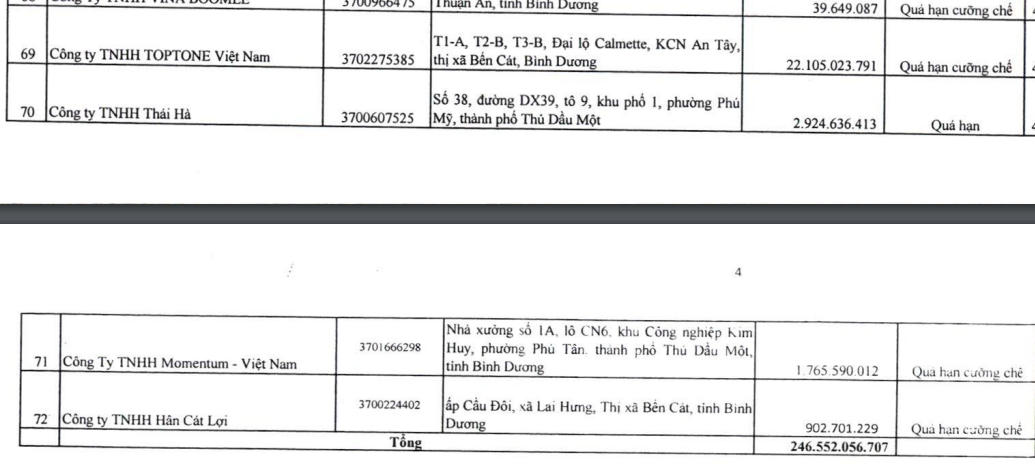 Đứng thứ hai trong danh sách nợ thuế lớn là Công ty TNHH MTV Sản xuất, thương mại xuất nhập khẩu Lưu Gia Phát, địa chỉ tại số 45/8 khu phố 1, phường Định Hoà, TP Thủ Dầu Một, tỉnh Bình Dương. Công ty có số tiền thuế, tiền chậm nộp, tiền còn nợ là hơn 47,6 tỷ đồng, tình trạng quá hạn cưỡng chế.