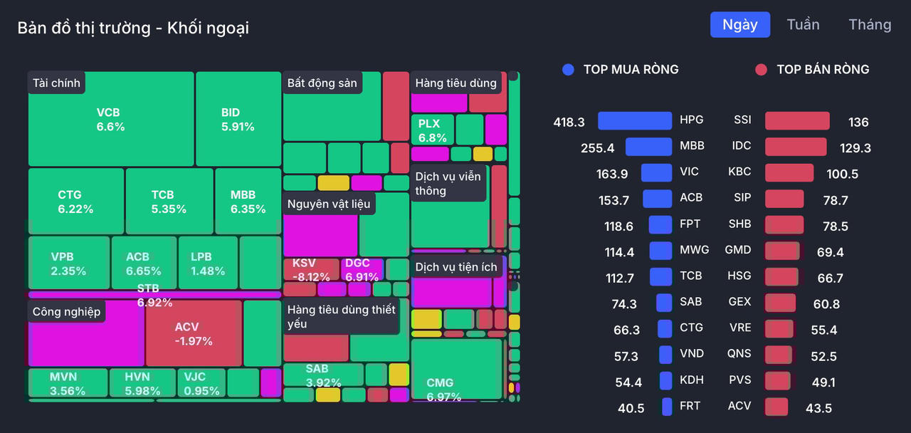 Về giao dịch của khối ngoại, khối này quay lại mua ròng hơn 974 tỷ đồng trên sàn HOSE, tập trung tại các mã HPG (415,51 tỷ đồng), MBB (246,87 tỷ đồng), VIC (160,12 tỷ đồng) và ACB (151,15 tỷ đồng).