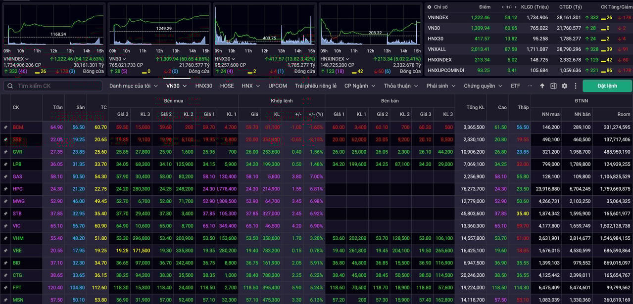 Tâm điểm của phiên giao dịch hôm nay thuộc về nhóm bluechip, khi rổ VN30 ghi nhận 28/30 mã tăng, trong đó có tới 5 mã tăng trần, bao gồm: GAS, MWG, STB, VIC, HPG. Nhờ lực cầu mạnh mẽ tại nhóm vốn hóa lớn, chỉ số VN30 bật tăng hơn 60 điểm, trở lại mốc 1.309 điểm.