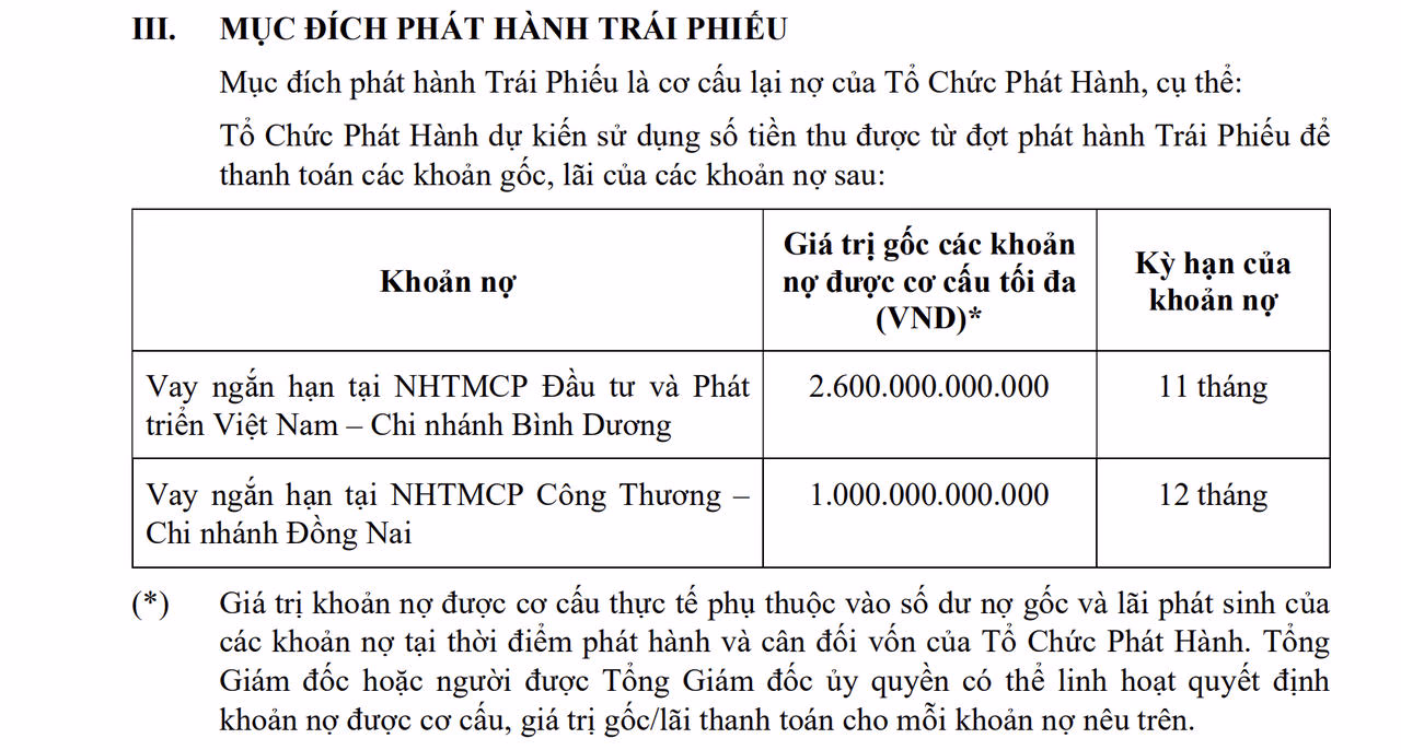 Trong đó, khoản vay tại BIDV có giá trị gốc được cơ cấu tối đa là 2.600 tỷ đồng, kỳ hạn 11 tháng; còn khoản vay tại VietinBank có giá trị gốc khoản nợ được cơ cấu tối đa là 1.000 tỷ đồng, kỳ hạn 12 tháng.