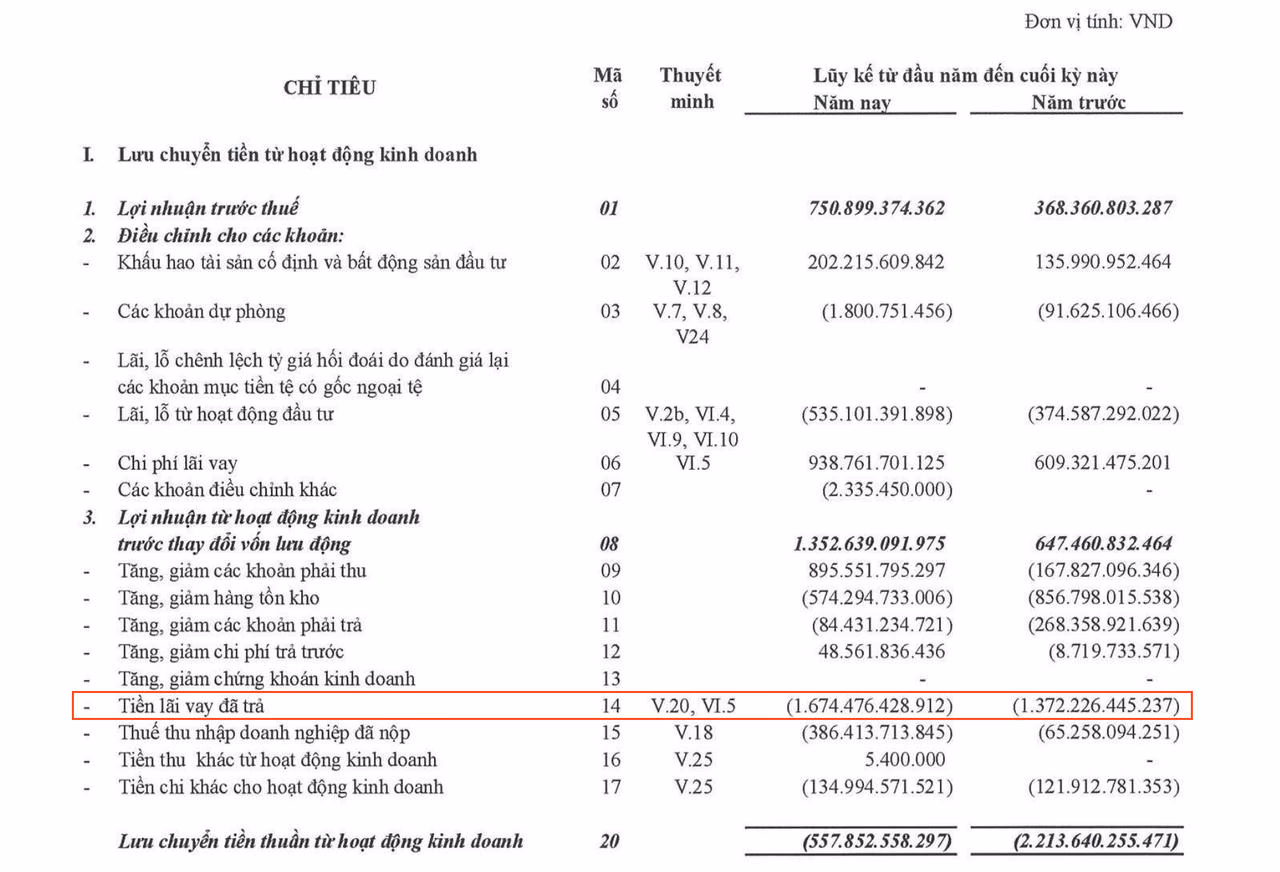 Theo báo cáo lưu chuyển tiền tệ quý III/2023, tiền lãi vay đã trả trong 9 tháng của Becamex IDC lên tới gần 1.674 tỷ đồng, cao hơn 22% so với cùng kỳ. Điều này đồng nghĩa với việc mỗi ngày doanh nghiệp phải mang 6 tỷ đi trả lãi vay.
