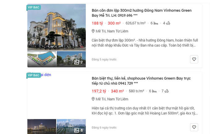 Theo thông tin từ Batdongsan.com.vn, một căn biệt thự diện tích 300m2 tại khu đô thị Vinhomes Green Bay hiện đang được rao bán với mức giá 188 tỷ đồng, tương đương hơn 600 triệu đồng/m2.