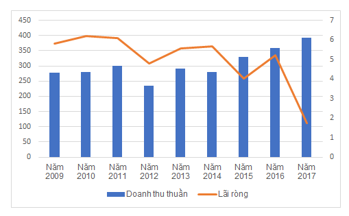 Giai đoạn 2009-2016, công ty ghi nhận lợi nhuận ròng dao động 4-6 tỷ đồng mỗi năm. Tuy nhiên, trong 2017 lãi sau thuế giảm 67% xuống 1,7 tỷ đồng. Nguyên nhân chính do giá vốn hàng bán tăng 20%, trong khi doanh thu chỉ tăng 13,5%.