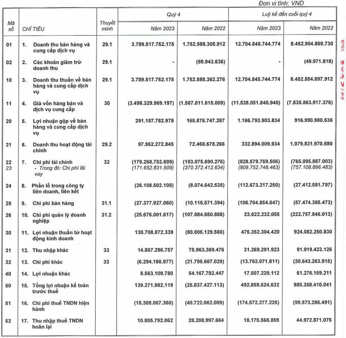 Giải trình lý do lợi nhuận sau thuế quý 4/2023 tăng hơn 10% so với cùng kỳ năm 2022, VCG cho biết, lợi nhuận sau thuế quý 4/2023 tại báo cáo tài chính hợp nhất là 131 tỷ đồng, tăng 170 tỷ đồng so với cùng kỳ năm 2022 tương ứng với mức tăng 443% là do doanh thu bán hàng và hoạt động tài chính trong kỳ đều tăng, đồng thời chi phí quản lý doanh nghiệp giảm so với cùng kỳ năm trước.