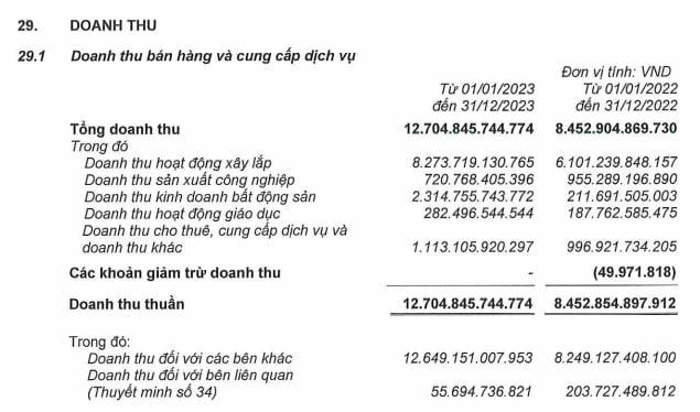 Trong cơ cấu doanh thu, hoạt động xây lắp vẫn đóng vai trò chủ đạo với doanh thu gần 8.274 tỷ đồng, tăng 36% so với cùng kỳ. Mảng kinh doanh bất động sản cũng ghi nhận mức tăng trưởng ấn tượng lên 2.315 tỷ đồng, cao gấp 11 lần so với kết quả 212 tỷ đồng cùng kỳ.