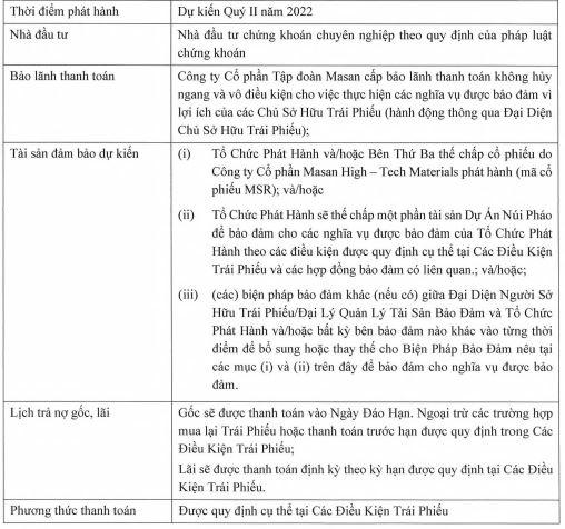 Đây là trái phiếu không chuyển đổi, không kèm chứng quyền và có đảm bảo bằng tài sản. Lô trái phiếu được Tập đoàn Masan bảo lãnh thanh toán không huỷ ngang.