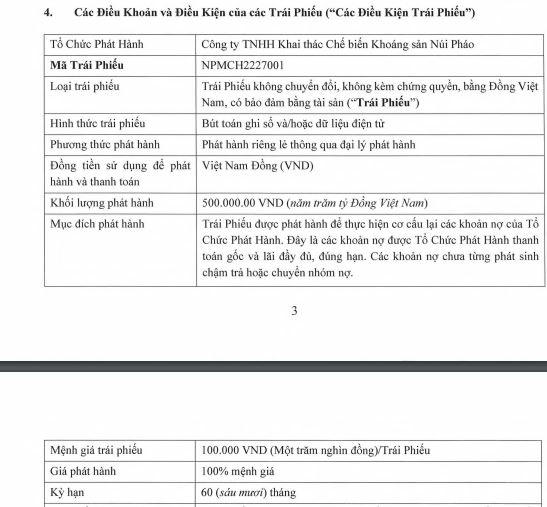 Theo thông tin từ Sở Giao dịch chứng khoán Hà Nội, ngày 25/5 vừa qua, Công ty Núi Pháo đã phát hành 1 lô trái phiếu với giá trị 500 tỷ đồng kỳ hạn 60 tháng. Đến ngày 31/5 đã hoàn tất việc chào bán. Lãi suất cho 2 kỳ tính lãi đầu tiên là 9,3%. Lãi suất áp dụng cho các kỳ tính lãi tiếp theo bằng lãi suất tham chiếu tương ứng với mỗi kỳ tính lãi có liên quan cộng với biên độ là 4,24%, nhưng trong mọi trường hợp không thấp hơn 9,9%...