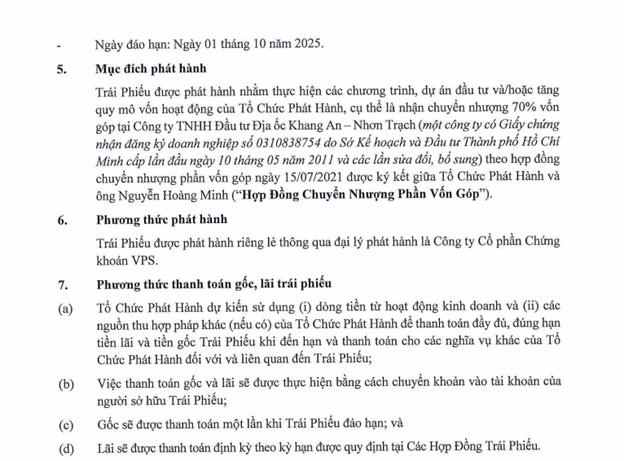 Hai lô trái phiếu trị giá 600 tỷ đồng còn lại cũng cùng một mục đích là nhận chuyển nhượng vốn góp tại Công ty TNHH Đầu tư Địa ốc Khang An – Nhơn Trạch.