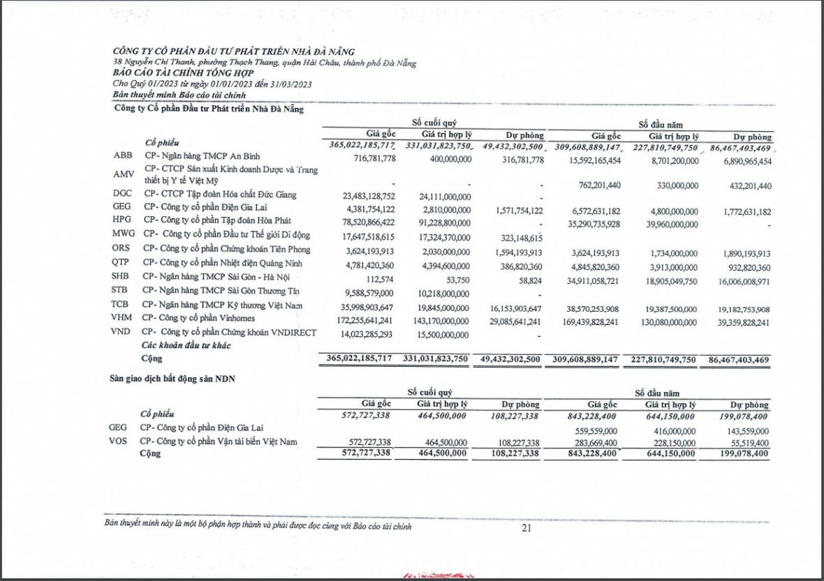 Cụ thể, báo cáo tài chính quý I/2023 của Nhà Đà Nẵng cho thấy, trong quý vừa qua, doanh nghiệp này đã mua mới các mã DGC của Tập đoàn Hoá chất Đức Giang, MWG của Thế giới Di động, STB của Ngân hàng Sài Gòn Thường Tín và VND của Chứng khoán VNDirect.