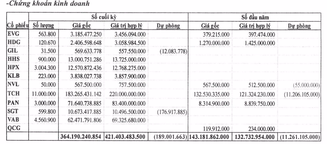 Dữ liệu từ bảng cân đối kế toán cho thấy, tính đến cuối quý II/2025, Lideco đã đầu tư hơn 364 tỷ đồng vào chứng khoán kinh doanh, tăng gấp 2,5 lần so với đầu năm. Danh mục cổ phiếu của doanh nghiệp khá đa dạng, bao gồm: 11 triệu cổ phiếu TCH, hơn 4,5 triệu cổ phiếu VAB, 3 triệu cổ phiếu HPX, 3 triệu cổ phiếu PAN, 900.000 cổ phiếu HHS, 599.800 cổ phiếu SGT, cùng nhiều mã khác. Trong đó, các mã như GIL, HHS, HPX, KLB, SGT, VAB được mua mới trong quý II.