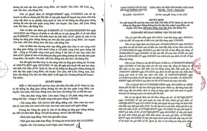 Cụ thể, Phó giám đốc Sở Giao thông Vận tải (GTVT) TP. Hà Nội Trần Hữu Bảo có quyết định phê duyệt lựa chọn nhà thầu tại Gói thầu số 03: Quản lý, bảo trì hệ thống hạ tầng giao thông đường bộ trên địa bàn các quận: Hoàn Kiếm, Ba Đình, Đống Đa, Hai Bà Trưng, Hoàng Mai, các cầu lớn: Nhật Tân, Chương Dương, Vĩnh Tuy, Thanh Trì, đường nhánh, đường gom và đường dẫn hai đầu cầu Nhật Tân, đường Võ Chí Công. Theo đó, nhà thầu trúng thầu là CTCP Công trình giao thông Hà Nội, với giá trúng thầu 689,9 tỷ đồng, giá dự toán của gói thầu là 700,4 tỷ đồng.
