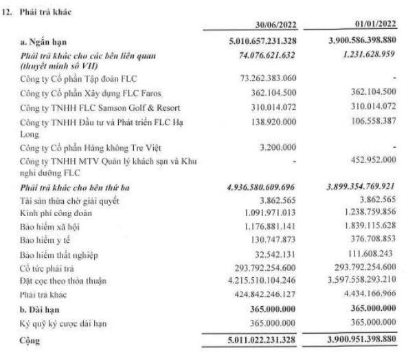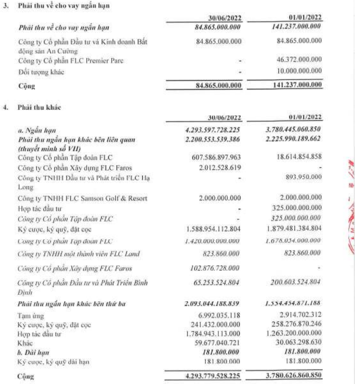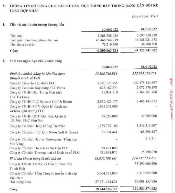 Cụ thể, các khoản phải thu Tập đoàn FLC tại ngày 30/6/2022 là xấp xỉ 615 nghìn tỷ đồng trong đó, khoản thu ngắn hạn hơn 7.300 tỷ đồng, phải thu dài hạn là 607 nghìn tỷ đồng. Khoản phải thu của FLC Faros là 2.635 tỷ đồng.