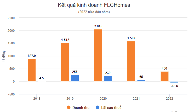 Lũy kế 6 tháng đầu năm 2022, FLCHomes báo cáo doanh thu thuần giảm 38,6% còn 401 tỷ đồng, lỗ sau thuế 43,6 tỷ đồng trong khi nửa đầu năm ngoái có lãi gần 27 tỷ.