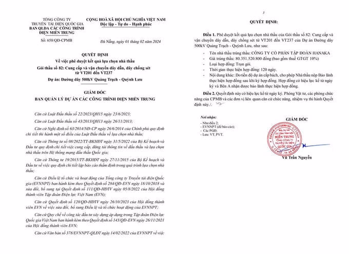 Cũng trong ngày 1/2/2024, Tập đoàn tiếp tục trúng Gói thầu số 82: Cung cấp và vận chuyển dây dẫn, dây chống sét từ VT201 đến VT237, thuộc dự án đường dây 500kV Quảng Trạch – Quỳnh Lưu. Giá trúng thầu hơn 80,351 tỷ đồng, giá dự toán gói thầu hơn 85,208 tỷ đồng.