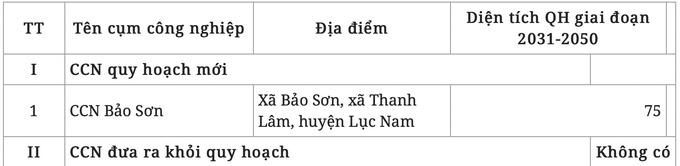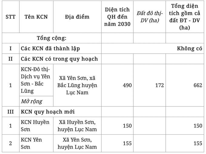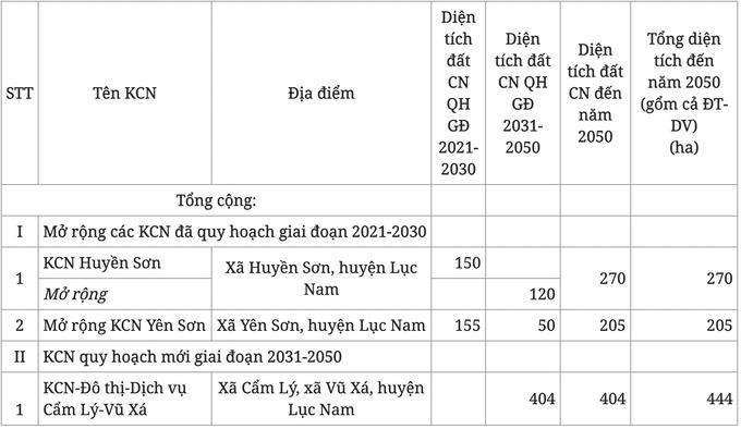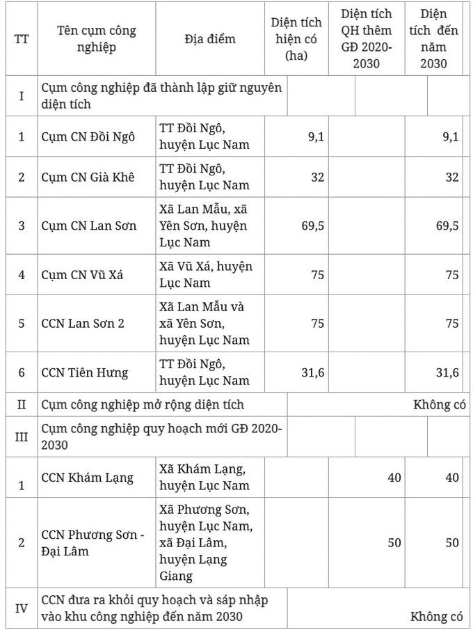 Theo quy hoạch, đến năm 2030, huyện Lục Nam sẽ có 3 khu công nghiệp và 8 cụm công nghiệp, bao gồm: