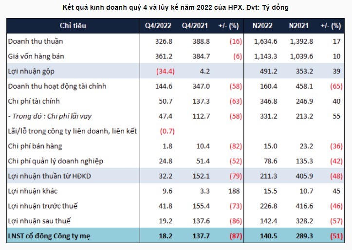 Theo đó, tại Công ty CP Đầu tư Hải Phát (Hải Phát Invest - HPX) công bố cho thấy, tổng doanh thu thuần hợp nhất ghi nhận trong quý IV/2022 là 327 tỷ đồng, giảm 16% so với cùng kỳ năm trước.