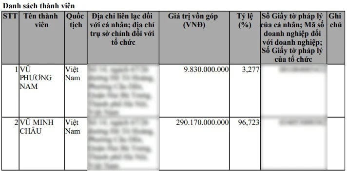 Tháng 6/2024, Bảo Tín Minh Châu tiến hành nâng vốn điều lệ lên thành 300 tỷ đồng. Lúc này, ông Vũ Minh Châu góp 290,12 tỷ đồng, sở hữu 96,723% cổ phần; ông Vũ Phương Nam giữ nguyên phần vốn góp 9,83 tỷ đồng, tương ứng 3,277% cổ phần.