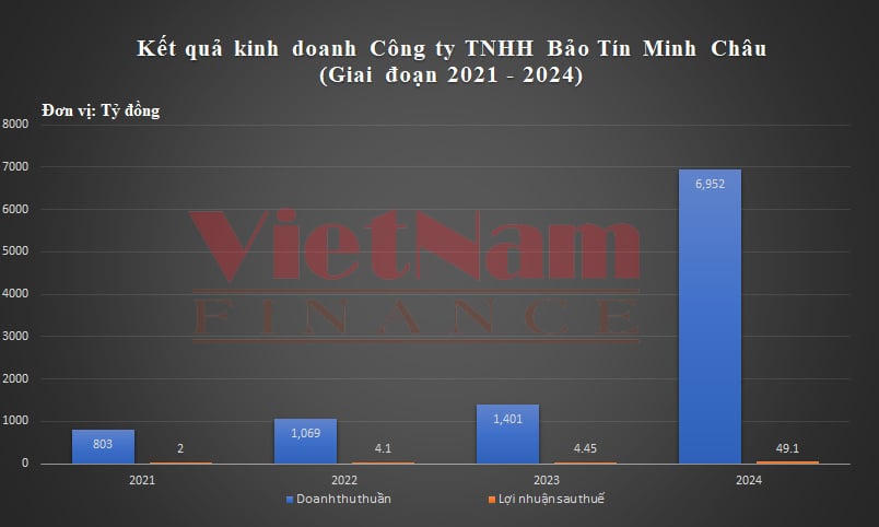 Cụ thể, kết thúc năm 2024, Bảo Tín Minh Châu đạt doanh thu thuần hơn 6.952 tỷ đồng, tăng 396% so với năm 2023. Những năm trước đó, doanh thu của doanh nghiệp chỉ dao động ở mức trên dưới 1.000 tỷ đồng/năm.