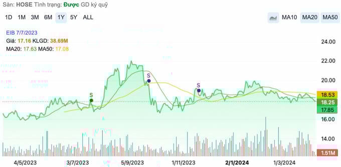 Trong bối cảnh đó, cổ phiếu EIB cũng không có đà bứt phá. Giai đoạn tháng 7, tháng 8/2023 cổ phiếu EIB có lúc chạm ngưỡng 22.000 đồng/cổ phiếu và sau đó giảm mạnh. Từ mấy tháng cuối năm 2023 đến những tháng đầu năm 2024 EIB luôn duy trì mức giá dưới 20.000 đồng/cổ phiếu.