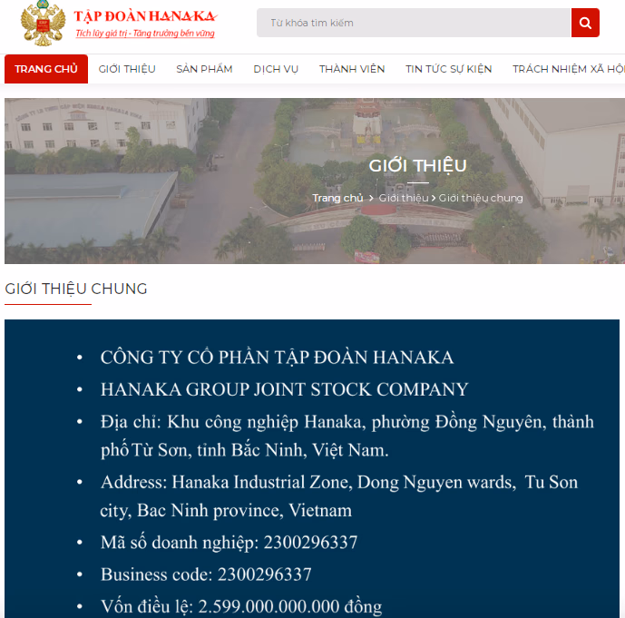 Theo thông tin trên Cổng thông tin quốc gia về đăng ký doanh nghiệp, Công ty cổ phần Tập đoàn Hanaka (Tập đoàn Hanaka) được thành lập vào ngày 14/2/2007, có địa chỉ tại Khu công nghiệp Hanaka, phường Trang Hạ, Phường Đồng Nguyên, Thành phố Từ Sơn, Tỉnh Bắc Ninh.