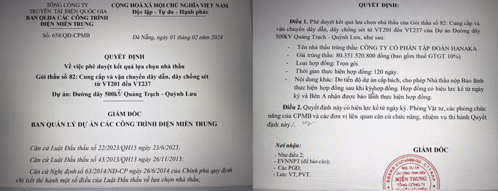 Cũng trong ngày 1/2/2024, Giám đốc BQLDA các công trình điện Miền Trung, thuộc Tổng công ty Truyền tải điện Quốc gia Vũ Trần Nguyễn tiếp tục ký quyết định lựa chọn nhà thầu tại Gói thầu số 82: Cung cấp và vận chuyển dây dẫn, dây chống sét từ VT201 đến VT237, thuộc dự án đường dây 500kV Quảng Trạch – Quỳnh Lưu cho Tập đoàn Hanaka. Nhà thầu trúng thầu với giá trúng thầu hơn 80,351 tỷ đồng, giá dự toán gói thầu hơn 85,208 tỷ đồng.