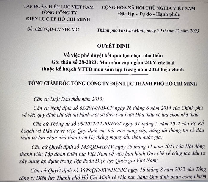 Tiếp đó, ngày 11/1/2024, Giám đốc BQLDA lưới điện phân phối TP. HCM, Tổng công ty điện lực TP. HCM Lê Thanh Tuấn ký quyết định phê duyệt lựa chọn nhà thầu Gói thầu số 26-2023: cáp ngầm trung thế các loại đợt 2 thuộc kế hoạch mua sắm VTTB tập trung năm 2023 (hiệu chỉnh đợt 4) cho Liên danh Tập đoàn Hanaka - Công ty cổ phần cáp điện và hệ thống LS-VINA.