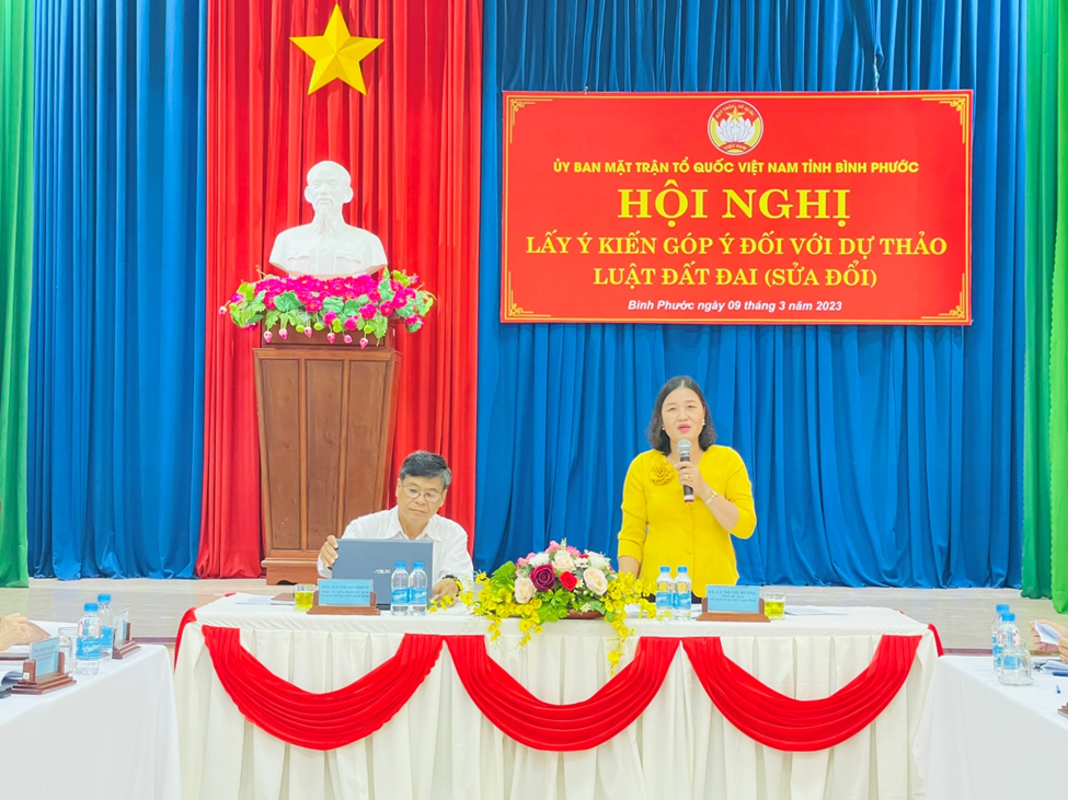 | Các Phó Chủ tịch UBMTTQVN tỉnh Bình Phước Nguyễn Thanh Bình, Lã Thị Thu Hương chủ trì hội nghị lấy ý kiến góp ý dự thảo Luật Đất đai (sửa đổi). |