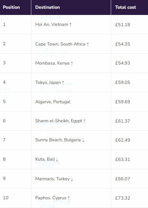 Bảng xếp hạng này dựa trên phân tích giá trị đồng tiền, giá cả chi tiêu tại điểm đến và chi phí du lịch cần thiết ở 40 điểm đến nghỉ dưỡng phổ biến trên thế giới.