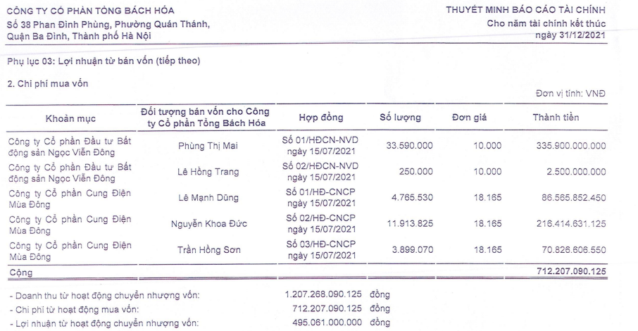 Tổng Bách Hóa cũng mua hơn 20,58 triệu cổ phiếu Cung Điện Mùa Đông từ ông Lê Mạnh Dũng, ông Nguyễn Khoa Đức, ông Trần Hồng Sơn với giá 18.165 đồng/cổ phần, tổng giá trị 373,8 tỷ đồng và bán lại với giá 22.489 tỷ đồng/cổ phần, thu về 462,8 tỷ đồng.