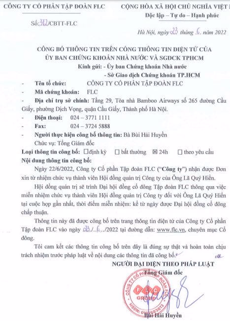 Theo nội dung công bố thông tin, Ngày 22/5/2022, Công ty Cổ phần Tập đoàn FLC nhận được Đơn xin từ nhiệm chức vụ thành viên Hội đồng quản trị Công ty của ông Lã Quý Hiển. HĐQT sẽ trình ĐHĐCĐ tập đoàn FLC thông qua việc miễn nhiệm ông Lã Quý Hiển tại phiên họp gần nhất, thời điểm miễn nhiệm kể từ ngày ĐHĐCĐ chấp thuận.