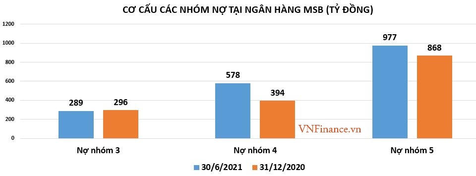 Cụ thể, tính đến 30/6/2021, tổng nợ xấu của MSB tăng 18% so với đầu năm, lên hơn 1.844 tỷ đồng. Trong đó, nợ nghi ngờ (nợ nhóm 4) tăng 47% lên hơn 578 tỷ đồng và nợ có khả năng mất vốn (nợ nhóm 5) tăng 13% lên gần 977 tỷ đồng. Kéo theo tỷ lệ nợ xấu tăng từ 1,96% vào hồi đầu năm lên 2,02%. Nợ xấu tăng nhưng tỷ lệ bao phủ nợ xấu tại MSB chỉ ở mức 58,5% (nằm trong top thấp nhất hệ thống).