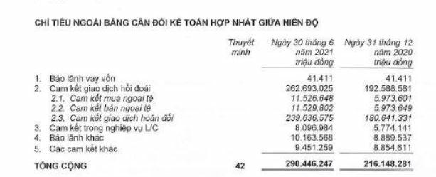 Trong đó, cam kết bảo lãnh vay vốn chỉ chiếm phần nhỏ nhưng cam kết trong bảo lãnh khác lại tăng 14% ghi nhận hơn 10.163 tỷ đồng, còn cam kết trong nghiệp vụ L/C tăng 40% lên gần 8.097 tỷ đồng.