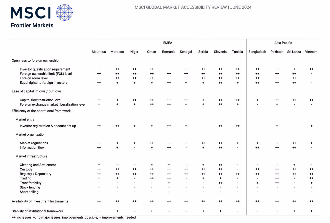 Để được phân loại là Thị trường Cận biên Nâng cao, yêu cầu được đặt ra là xếp hạng tiếp cận thị trường không được thấp hơn mức “++” ở quá 2 trong số các tiêu chí trọng yếu, bao gồm: hiệu quả của khung vận hành (trừ giao dịch cho vay chứng khoán và bán khống), Mức độ mở cửa cho nhà đầu tư nước ngoài, và Mức độ thuận lợi của dòng vốn vào/ra; không được tồn tại các vấn đề ở mức hạn chế dòng vốn (phải được xếp hạng “++”).