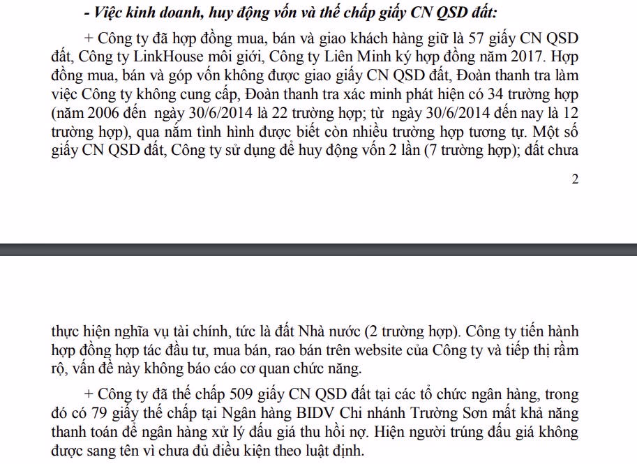 Cụ thể, Kết luận Thanh tra nêu rõ, Công ty đã hợp đồng mua, bán và giao khách hàng giữ là 57 giấy CN QSD đất, Công ty LinkHouse môi giới, Công ty Liên Minh ký hợp đồng năm 2017. Hợp đồng mua, bán và góp vốn không được giao giấy CN QSD đất, Đoàn thanh tra làm việc Công ty không cung cấp, Đoàn thanh tra xác minh phát hiện có 34 trường hợp (năm 2006 đến ngày 30/6/2014 là 22 trường hợp; từ ngày 30/6/2014 đến nay là 12 trường hợp), qua nắm tình hình được biết còn nhiều trường hợp tương tự. Một số giấy CN QSD đất, Công ty sử dụng để huy động vốn 2 lần (7 trường hợp); đất chưa thực hiện nghĩa vụ tài chính, tức là đất Nhà nước (2 trường hợp). Công ty tiến hành hợp đồng hợp tác đầu tư, mua bán, rao bán trên website của Công ty và tiếp thị rầm rộ, vấn đề này không báo cáo cơ quan chức năng.