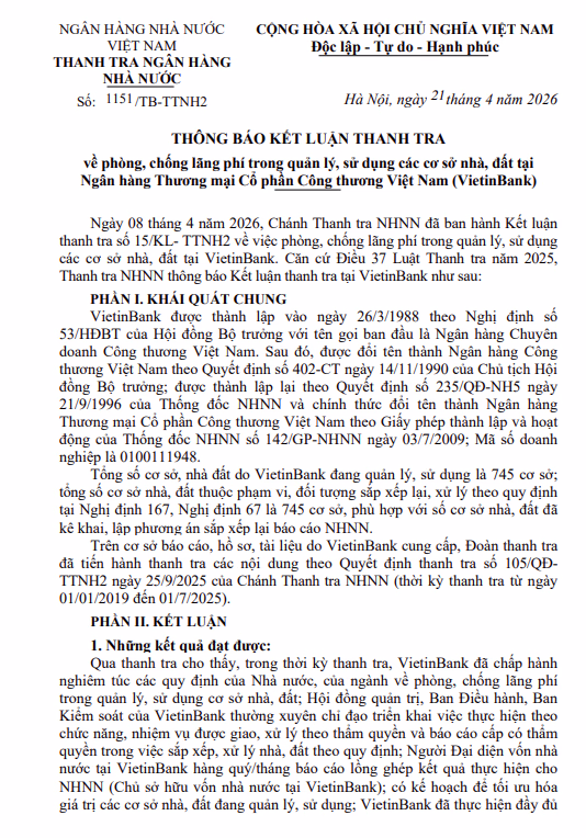 Ngày 21/4/2026, Thanh tra Ngân hàng Nhà nước (NHNN) đã có Thông báo số 1151/TB-TTNH2 Kết luận thanh tra về phòng, chống lãng phí trong quản lý, sử dụng các cơ sở nhà, đất tại Ngân hàng Thương mại CP Công thương Việt Nam (VietinBank).