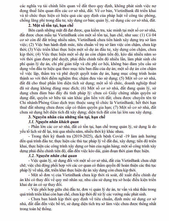 Qua thanh tra cho thấy, trong thời kỳ thanh tra một số cơ sở nhà, đất được chọn mẫu tại VietinBank còn một số tồn tại, hạn chế. Cụ thể, có 4 cơ sở còn để đất trống nhiều năm, VietinBank chưa tiến hành xây dựng trụ sở làm việc; Việc ban hành định mức, tiêu chuẩn về trụ sở làm việc còn chậm, chưa kịp thời; Việc triển khai thực hiện một số dự án đầu tư, xây dựng còn chậm, chưa kịp thời.