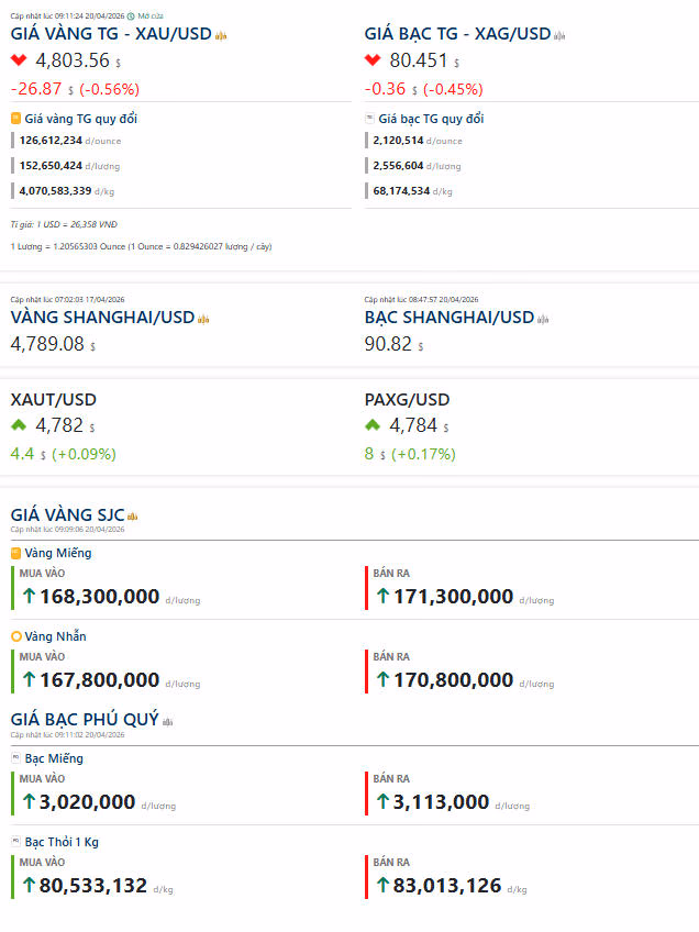 Sáng 20/4, giá vàng thế giới được niêm yết trên Kitco ở mức 4.775 USD/ounce, giảm 44 USD/ounce so với đầu giờ sáng qua. Trong nước, giá vàng miếng và vàng nhẫn sáng nay vẫn giữ nguyên so với phiên trước. Với nhà đầu tư theo dõi dòng tiền trú ẩn, đây là một nhịp điều chỉnh đáng chú ý khi thị trường quốc tế vẫn đang giằng co giữa áp lực chốt lời và các yếu tố hỗ trợ từ kinh tế vĩ mô.