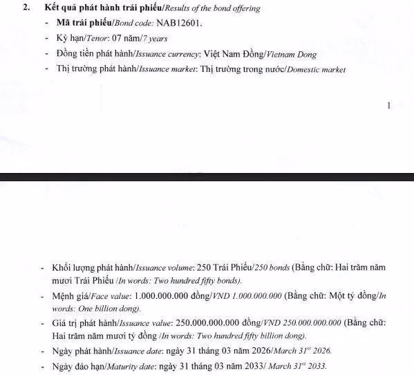 Đây là 2 lô trái phiếu đầu tiên mà Nam A Bank phát hành trong năm 2026, cho thấy ngân hàng đang chủ động bổ sung nguồn vốn trung và dài hạn để phục vụ hoạt động kinh doanh.