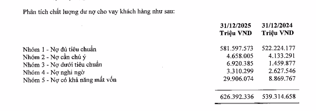 Theo thống kê từ 27 ngân hàng trên sàn chứng khoán cho thấy, tổng số dư nhóm nợ 5 (có khả năng mất vốn) tại thời điểm 31/12/2025 đạt 166.707 tỷ đồng, tăng thêm 34.251 tỷ đồng, tương đương mức tăng 26% so với cuối năm 2024.