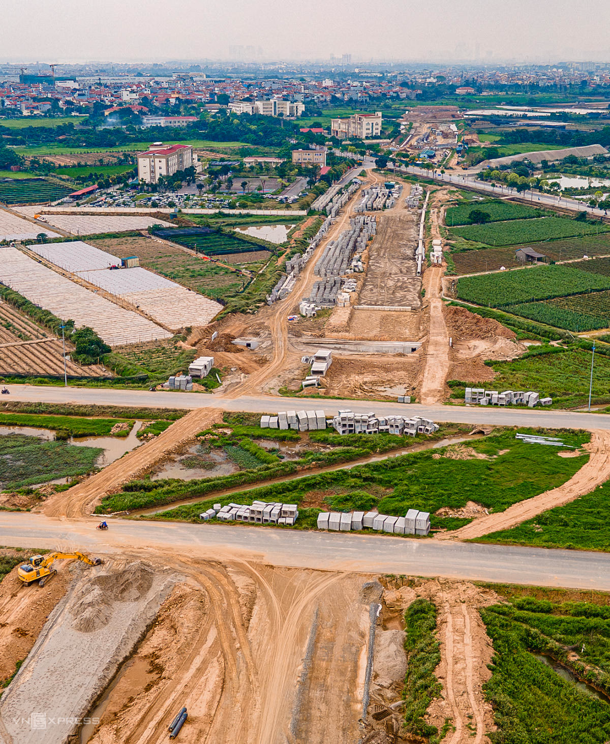 Đoạn từ sông Nhuệ đến đường Văn Tiến Dũng mới hoàn thành lớp thảm thô một chiều với 5 làn đường trên tổng số 10 làn. Người dân di chuyển qua đây thường xuyên phải chịu cảnh bụi bặm. Trong khi đó, cầu vượt sông Nhuệ - cây cầu duy nhất trên tuyến - vẫn chưa hoàn thành, công trường vắng công nhân, vật liệu xây dựng ngổn ngang.