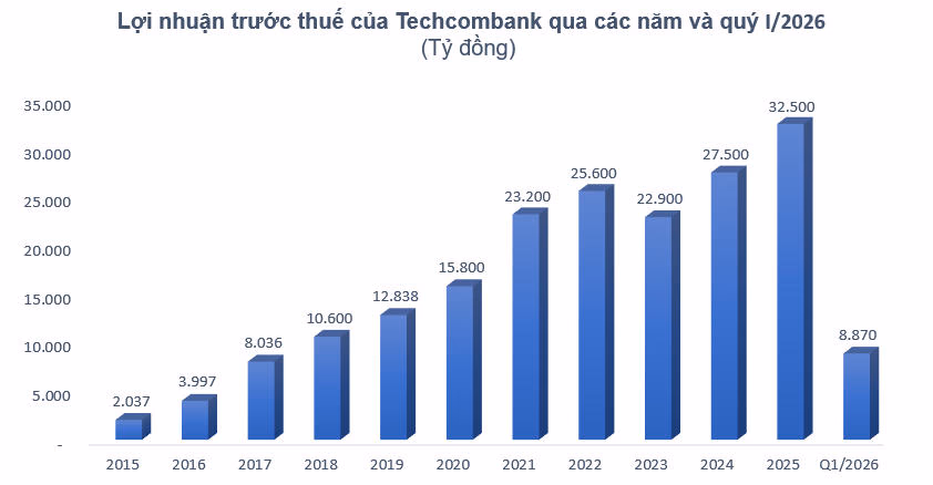 Trong quý đầu năm 2026, Techcombank ghi nhận lợi nhuận trước thuế gần 8.870 tỷ đồng, tăng 22,6% so với cùng kỳ, và cũng là mức lợi nhuận quý I cao nhất từ trước đến nay của ngân hàng.
