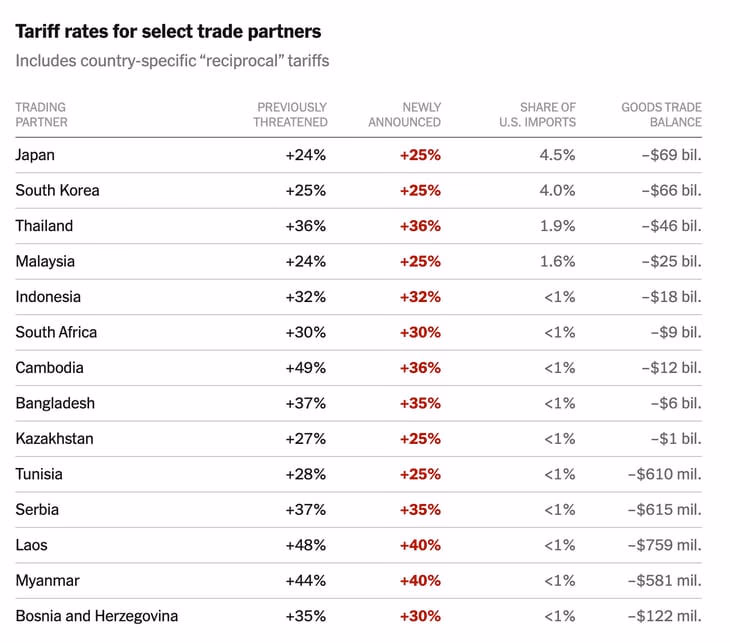Theo CNN, trong năm 2024, 14 quốc gia nhận thư áp thuế đã xuất khẩu tổng cộng 465 tỷ USD hàng hóa vào Mỹ, trong đó Nhật Bản và Hàn Quốc (lần lượt là đối tác thương mại lớn thứ 6 và 7 của Mỹ) chiếm tới 60% tổng giá trị, tương đương 280 tỷ USD.