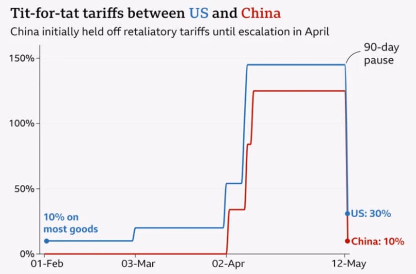 Việc Mỹ và Trung Quốc tạm dừng áp thuế không chỉ là dấu hiệu tích cực cho kinh tế toàn cầu mà còn mở ra cơ hội cho các cuộc đàm phán thực chất hơn. Theo đó, lệnh tạm dừng trong 90 ngày sẽ có hiệu lực từ ngày 14/5, với việc Mỹ giảm thuế quan đối với hàng hóa Trung Quốc xuống còn 30%, từ mức 145%. Trung Quốc sẽ giảm thuế nhập khẩu đối với hàng hóa Mỹ xuống còn 10%, từ mức 125%.