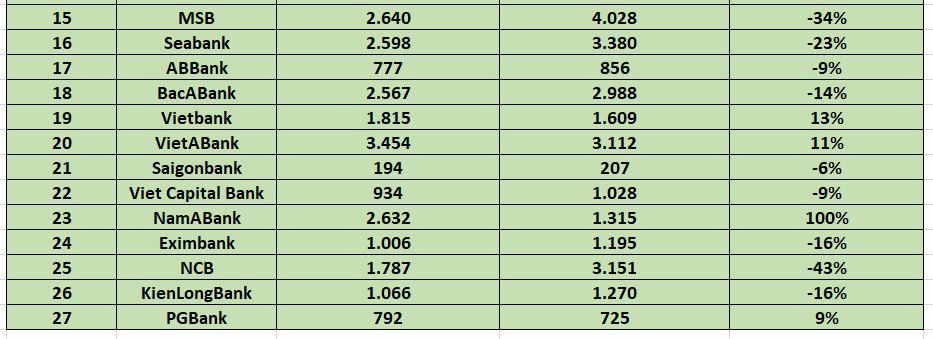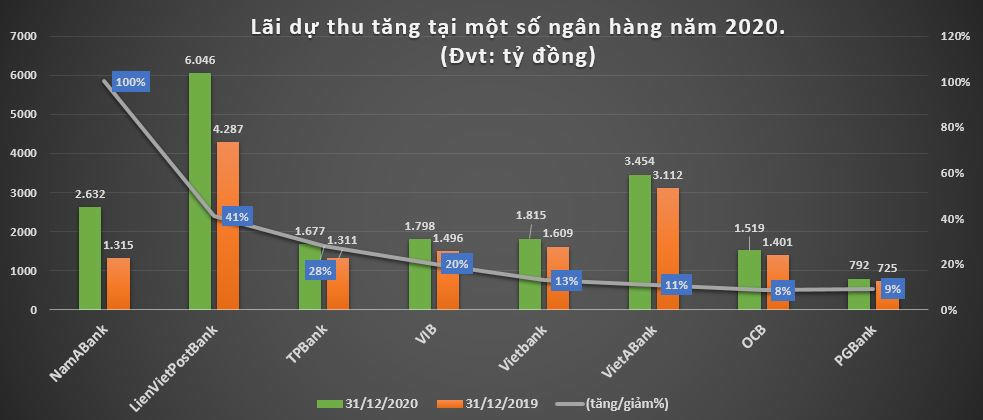 Một số ngân hàng khác, mức độ tăng lãi dự thu tuy chậm hơn song cũng chiếm tỷ trọng rất lớn. Cụ thể, OCB có lãi dự thu 1.519 tỷ đồng, tăng 8% so với đầu năm; lãi dự thu tại VietBank năm 2020 tăng 13%, lên mức 1.815 tỷ đồng; VietABank là 3.454 tỷ đồng, tăng 11% so với đầu năm;...