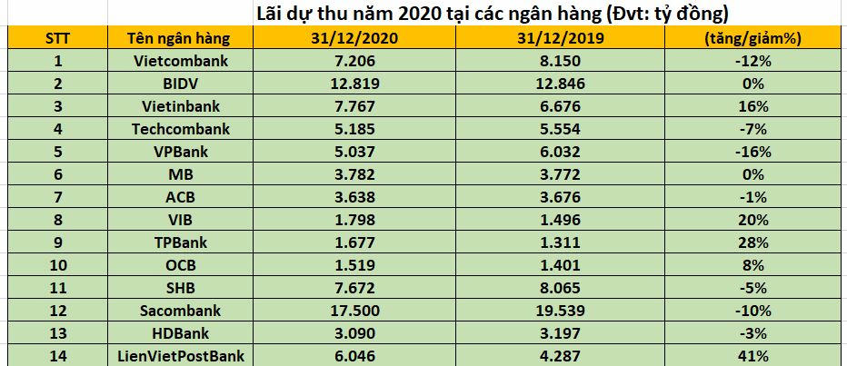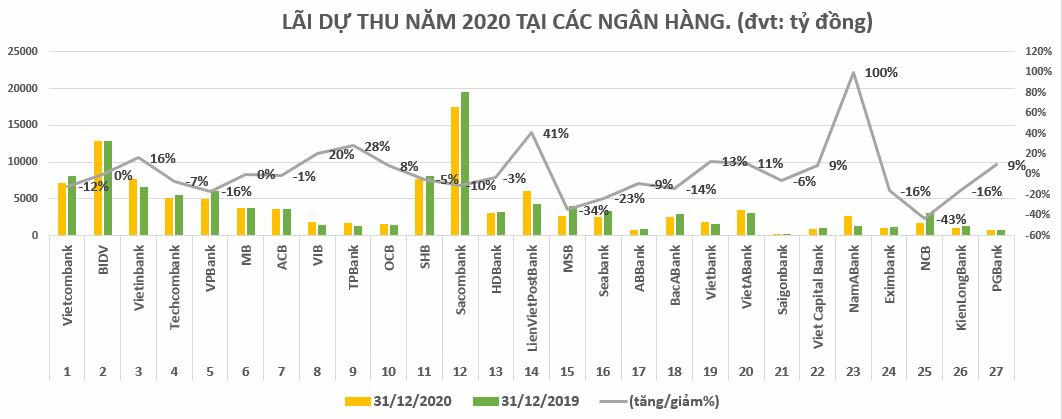 Tính đến ngày 2/2/2021, đã có khoảng 27 ngân hàng công bố báo cáo tài chính hợp nhất quý 4/2020. Năm 2020, khoản "lãi dự thu" tại các ngân hàng không biến động nhiều, thậm chí gần nửa ngân hàng đã công bố báo cáo tài chính lại cho thấy xu hướng giảm. Tuy nhiên, vẫn có ngân hàng ghi nhận con số tăng đột biến.