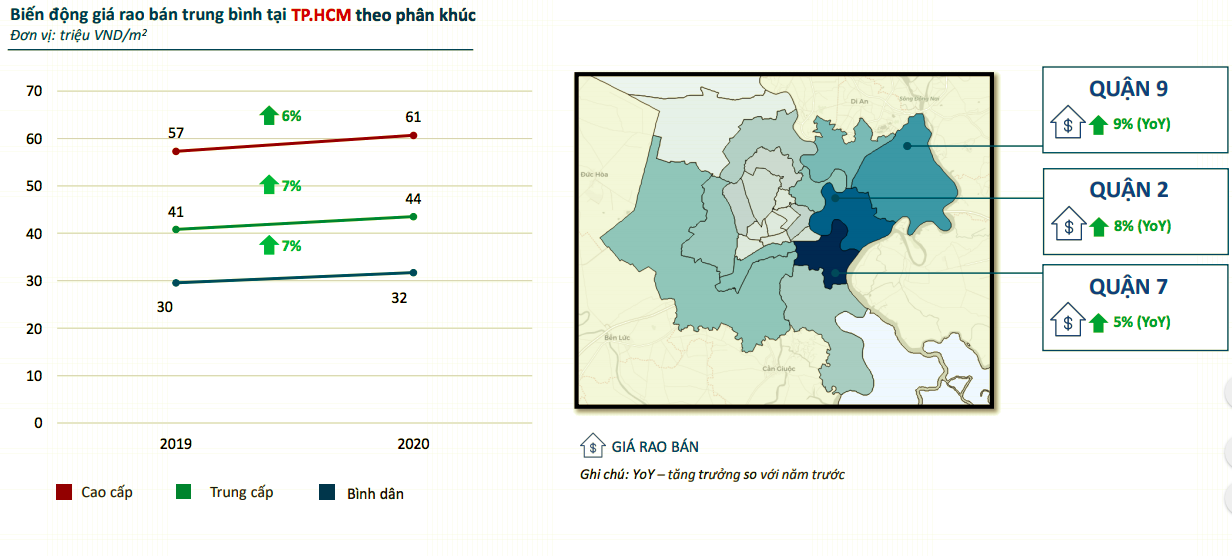 Tuy nhiên, thị trường vẫn dành tỷ trọng quan tâm lớn nhất đến chung cư trung cấp. Tổng kết 10 năm (từ 2009 - 2019), Batdongsan.com.vn thấy rằng tỷ lệ hộ gia đình ở chung cư tại TP.HCM tăng 67%, cao hơn Hà Nội (53%). Vị chuyên gia này dự báo, giá chung cư tại TP.HCM năm 2021 tăng 9% trong khi giá nhà riêng có xu hướng ổn định.