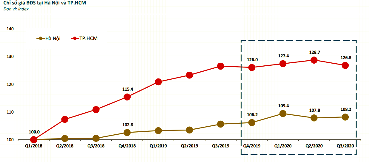 Đáng chú ý, chỉ số giá nhà tại Hà Nội và TP.HCM cũng có nhiều biến động trong năm 2020. Nếu chỉ số giá nhà tại Hà Nội có xu hướng tăng trưởng gần 2 điểm phần trăm thì tại TP.HCM con số này đã giảm gần 0,4 điểm phần trăm. Tuy nhiên, dù đối mặt khó khăn liên tiếp nhưng theo một khảo sát của đơn vị này, bất động sản vẫn là kênh đầu tư được lựa chọn nhiều nhất.