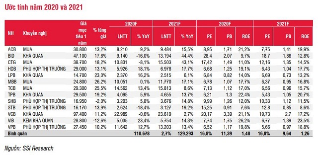 SSI Research nhận định triển vọng chung của ngành ngân hàng trong 2021 tốt hơn so với ước tính trước đây do ít bị ảnh hưởng từ đợt bùng phát thứ hai của dịch Covid-19. Nhóm chuyên gia phân tích của công ty chứng khoán này cũng điều chỉnh tăng ước tính lợi nhuận trước thuế cho các ngân hàng nghiên cứu cho năm 2020 và 2021 lần lượt đạt 110.700 tỷ đồng, tăng 3% so với cùng kỳ và 129.300 tỷ đồng, tăng 17%.