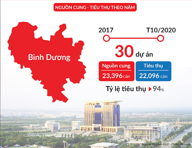 Ở quy mô rộng hơn, Bộ phận nghiên cứu và phát triển của DKRA Việt Nam (R&D DKRA Việt Nam) thống kê từ năm 2017 đến tháng 10/2020, Bình Dương có khoảng 30 dự án mới mở bán, cung cấp ra thị trường gần 23.400 căn hộ. Tỷ lệ tiêu thụ đạt khoảng 94%. Nguồn cung chủ yếu ở TP Dĩ An, TP Thuận An, TP Thủ Dầu Một, Thị xã Bến Cát.