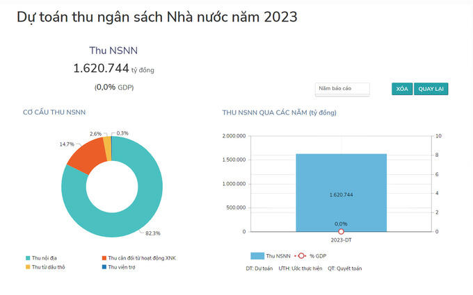 Bộ Tài chính cho biết: Trên cơ sở đánh giá tình hình thực hiện NSNN năm 2022 và kế hoạch phát triển kinh tế - xã hội năm 2023 (dự kiến tốc độ tăng GDP khoảng 6,5%, tốc độ tăng chỉ số giá tiêu dùng (CPI) bình quân khoảng 4,5%, tăng trưởng kim ngạch xuất khẩu khoảng 8% so với năm 2022). Dự toán tổng thu cân đối NSNN năm 2023 là 1.620,7 nghìn tỷ đồng.